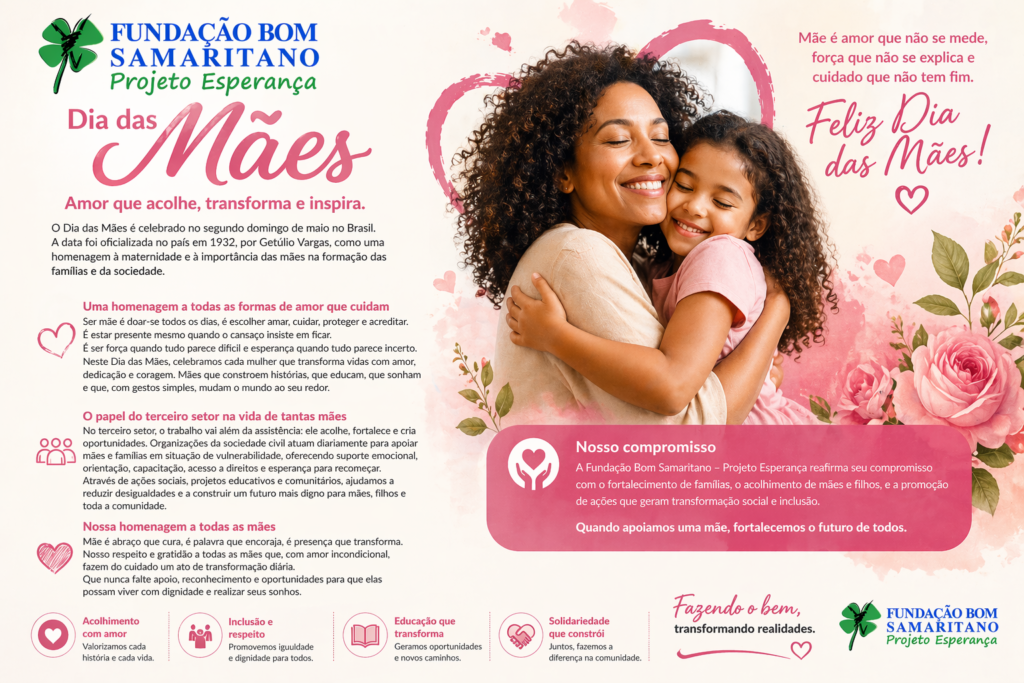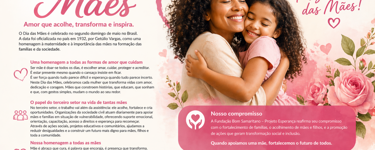 A Fundação Bom Samaritano – Projeto Esperança acredita que apoiar uma mãe é fortalecer toda uma geração. Por meio de ações sociais, educativas e comunitárias, a instituição atua no acolhimento, no desenvolvimento humano e na promoção da cidadania, criando oportunidades para que essas mulheres e suas famílias tenham um futuro mais digno.